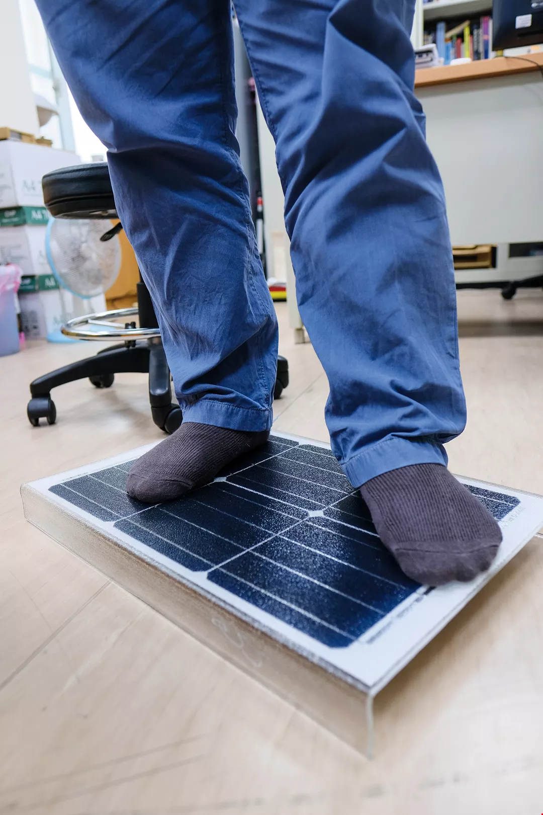In traditional solar panels, flat glass plates are mounted in an aluminum frame to provide extra strength. Fu developed a method for turning recycled PV glass into channel glass, a construction material, and then added solar cells to the new product. Team member Dai Shyue-bin, who holds a PhD in physics, uses a namecard to demonstrate how channel glass works. While a flat namecard is pretty flimsy, it can hold more weight if you fold the ends over to create a squared-off u-shape. Dai says that’s the principle underlying channel glass.