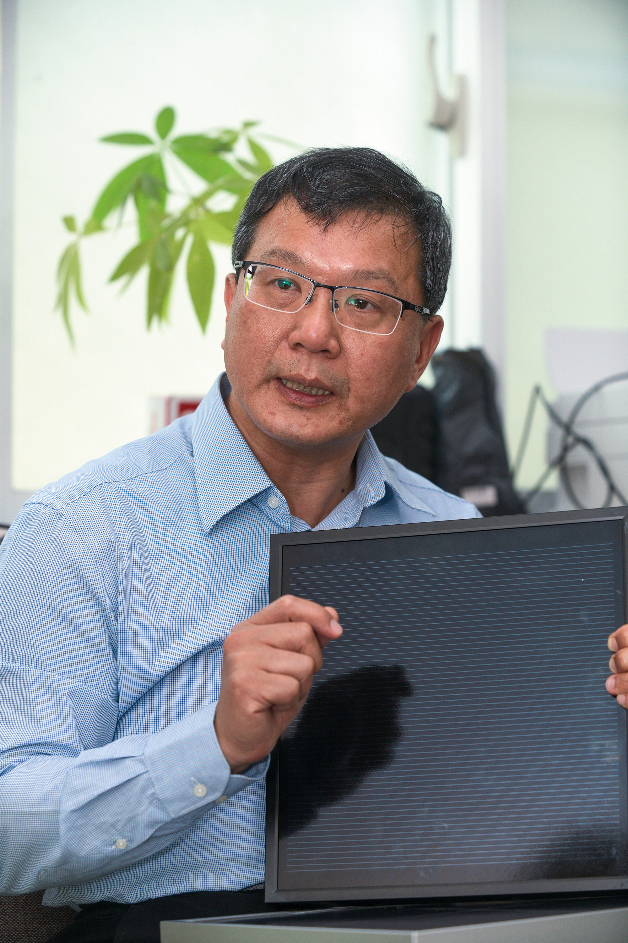 Fu Yaw-shyan has been researching solar power for more than 20 years. Here, he makes a point about the industry’s ups and downs by holding up a now obsolescent thin-film solar cell.
