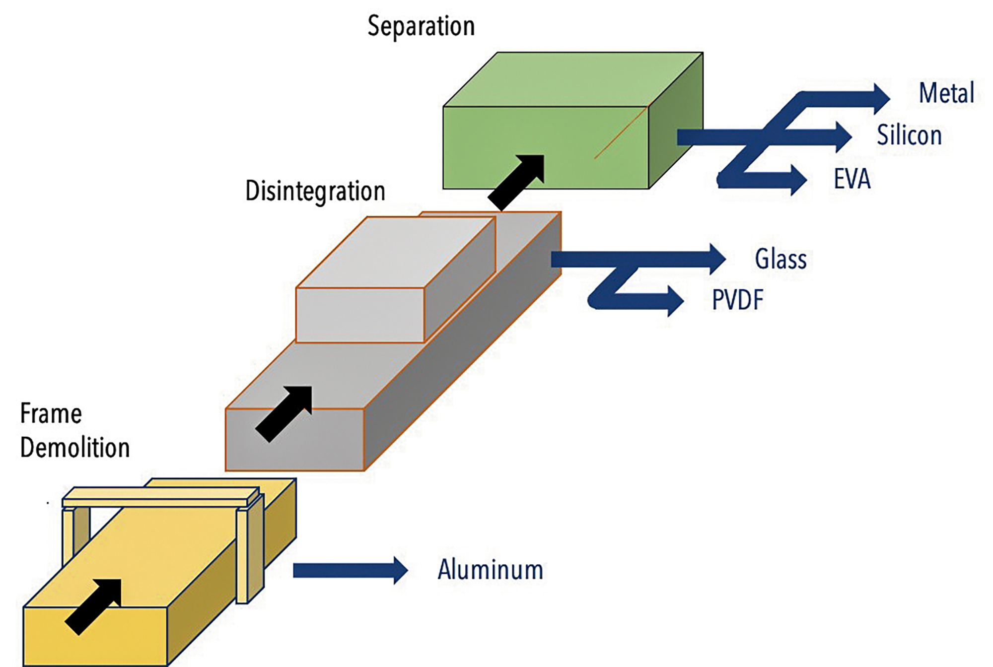 PV Cycle, a member-based PV takeback and recycling scheme established by the European Union, is currently the world leader in solar panel recycling. Processors typically disassemble the aluminum frames of the panels, then shred the remaining material and heat it to vaporize the EVA polymers and backsheets. The process enables the recovery of most of the aluminum, silicon, copper, silver and glass in the panels.