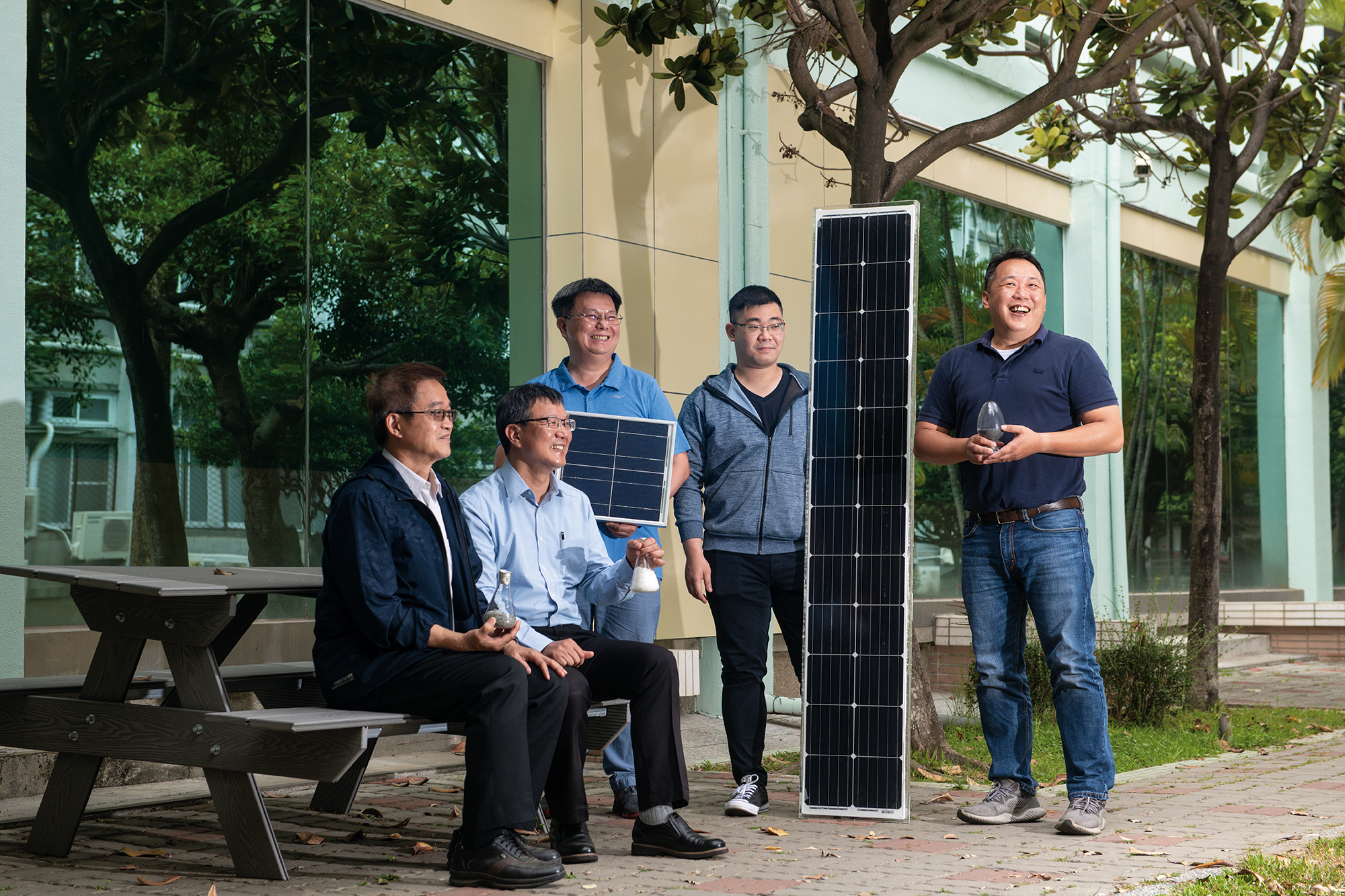 The team is doing its utmost to build a circular economy in PV cells by developing recycling methods and applications for recycled materials. From left to right: Dai Shyue-bin, Fu Yaw-shyan, Liu Cheng-chen, Ke How-wei, and Andrew Hung.