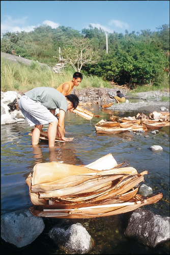 Washed areca palm leaf sheaths are used by the Amis as cooking vessels for making soup.