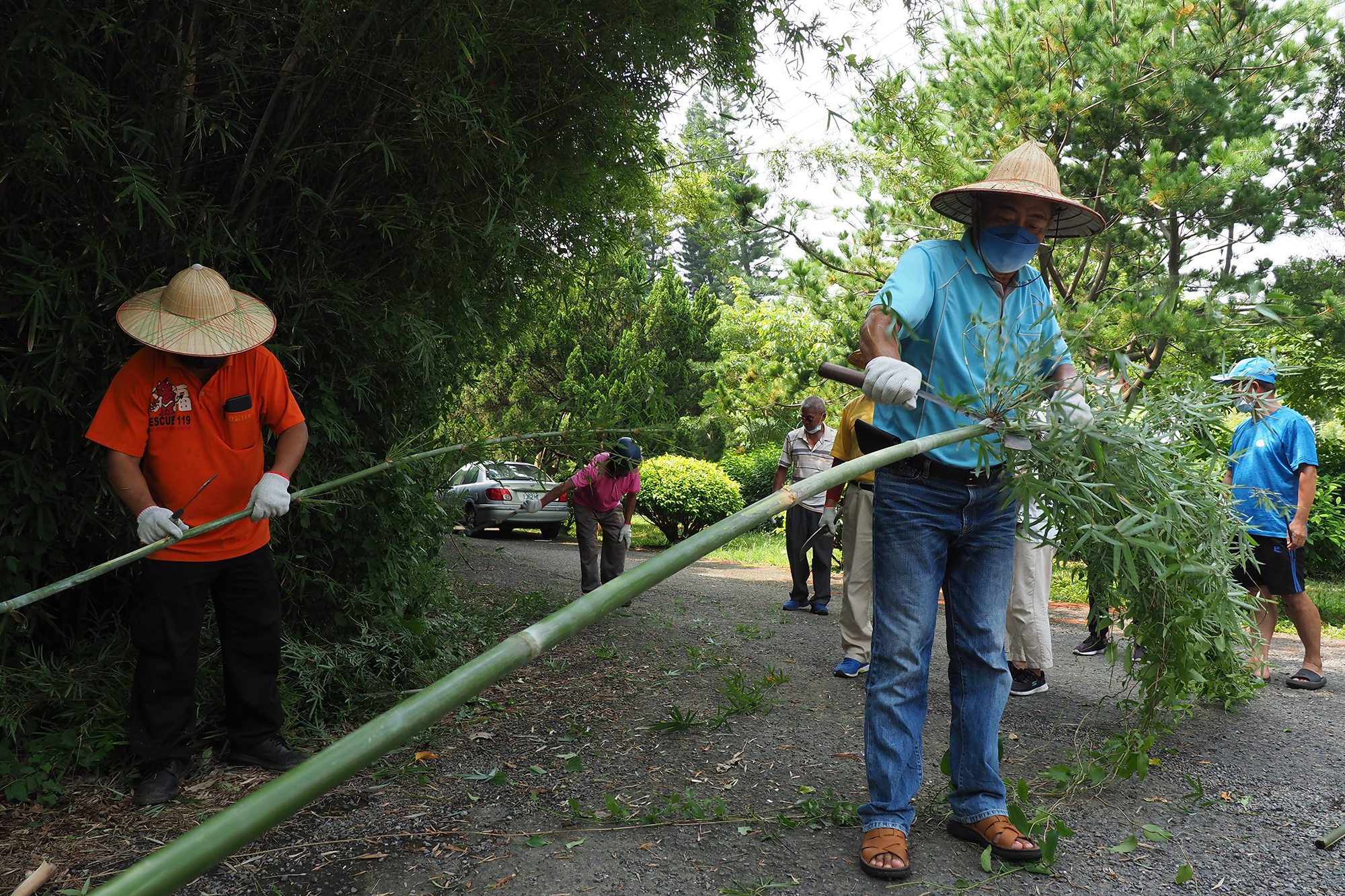 To make Earth God staffs, local residents select bamboo poles and chop them down.