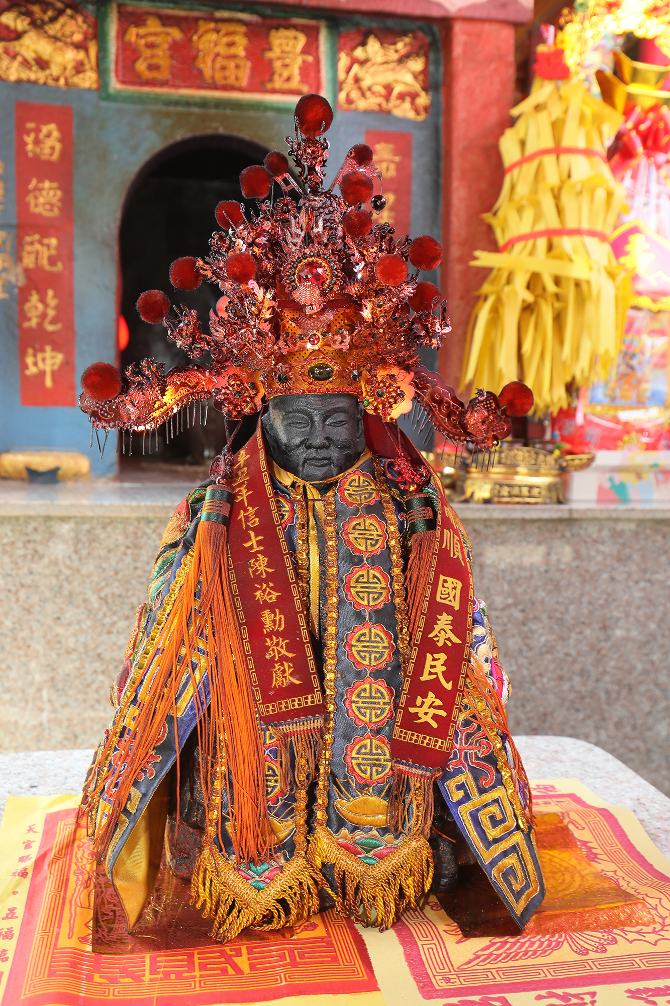 To throw a birthday party for the Earth God, village residents first take the statue from its niche and dress up the god in a new set of finery.