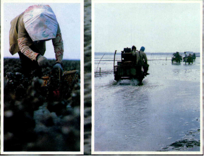 Yu used a different approach to solve the problems encountered by the oyster farmers at Putai in Chiayi County. Because the coastal waters there are comparatively deep, Yu recommended farmers to use the "buoyant barrel" method. Under this system, the barrels support the bamboo dredges, and as they move with the changes in the tides, they provide the young oysters with fresh feeding areas, thus enabling them to grow at a fast rate. This method also reduces the risk of attacks from pests such as the oyster-drill snails, and damage from polluted water. But farmers have to take special precautions to prevent damage to the barrels from typhoons which attack the island frequently. The biggest battle of all, however, is undoubtedly against pests, of which the oysterdrill snail is the most destructive. This creature, enclosed in a beautiful spiral shell about an inch long, has a tongue coated with cutting barbs with which it drills a hole through the shell valve and kills the oyster inside. To counter this menace, the farmers must periodically lift the oyster dredges out of the water and shake them violently or spray them with water so that the snails fall out.