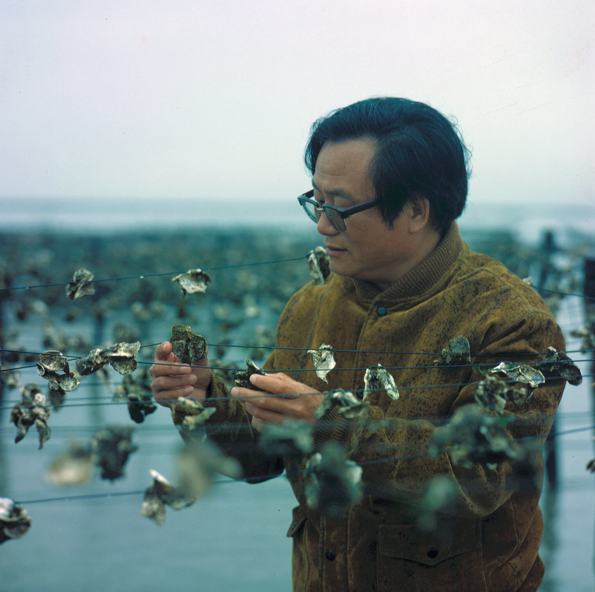 T. C. Yu, head of the Lukang Fishery Center has led the way in promoting oyster culture in Taiwan. Through his 30 years experience in fishery research, Yu was able to introduce what are known as "restraint spats" to oyster fishermen in Hsiangshan. After collecting the oyster eggs laid around August and September, he exposes them to the sun, and then the wind and sea, at alternate intervals to slow down their growth. In this way, he was able to produce a strain with great strength and vitality, which when transplanted, would survive even the harshest conditions. The young oysters then attach themselves with a limy secretion from their left mantle folds, to plastic cords strung horizontally or vertically from a bamboo dredge supported by stakes. This new approach to oyster farming has brought great prosperity to the oyster farmers of Hsiangshan.