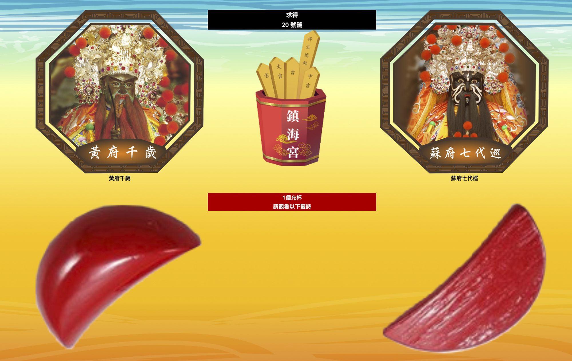 The online divination pages of Jhen Hai Temple, in both Chinese and English, explain the divination procedure. First you should recite in your heart your name, address and question three times. Then click on the “divine cylinder” (the container holding the fortune sticks) and after getting a divination number, click on “confirm” below to cast the jiaobei. If the result is “yes,” then your fortune verse and its explanation will appear below.