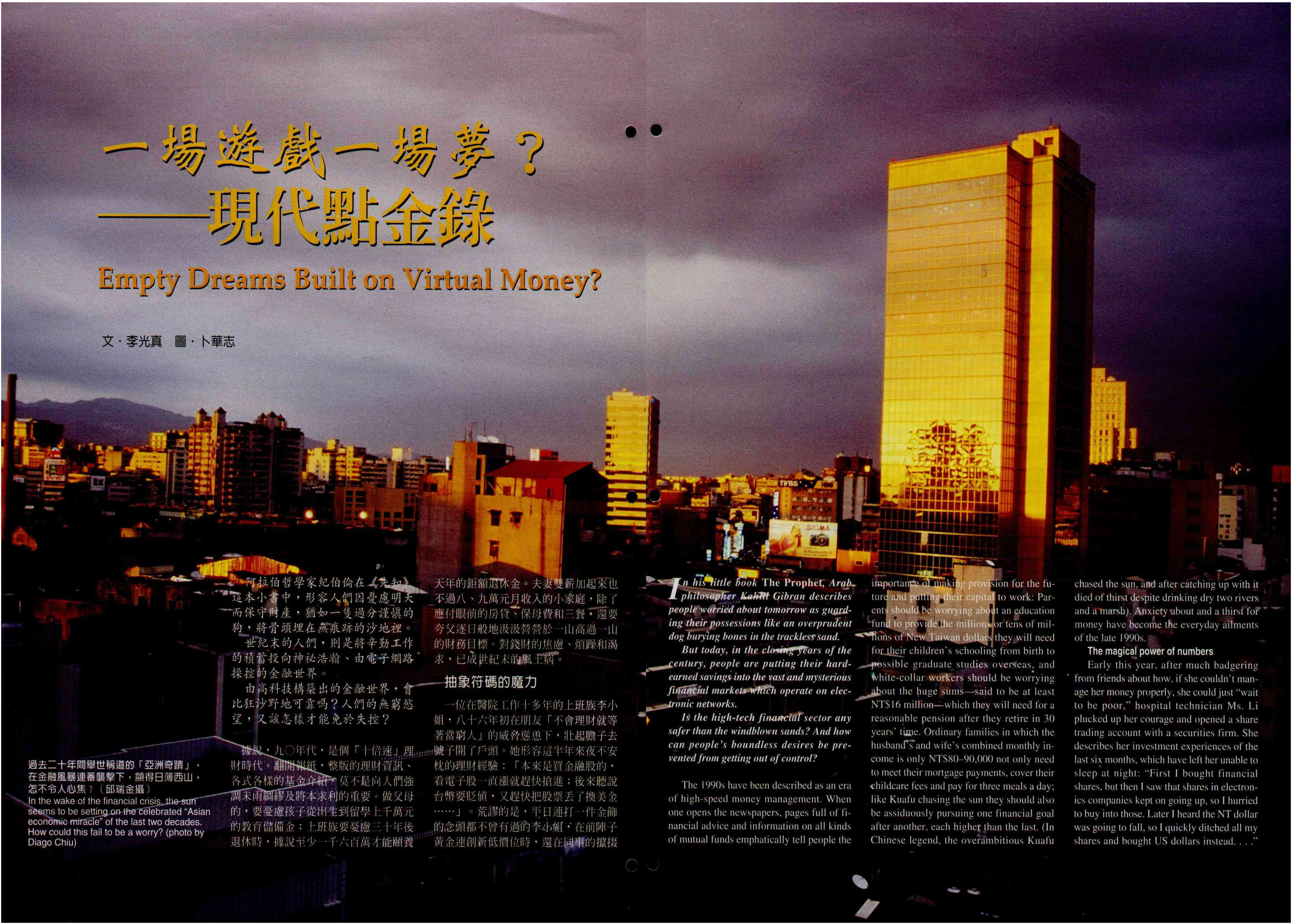 The 1990s have been described as an era of high-speed money management. When one opens the newspapers, pages full of financial advice and information on all kinds of mutual funds emphatically tell people the importance of making provision for the future and putting their capital to work: Parents should be worrying about an education fund to provide the millions or tens of millions of New Taiwan dollars they will need for their children's schooling from birth to possible graduate studies overseas, and white-collar workers should be worrying about the huge sums-said to be at least NT$16 million-which they will need for a reasonable pension after they retire in 30 years' time. Ordinary families in which the husband's and wife's combined monthly income is only NT$80-90,000 not only need to meet their mortgage payments, cover their childcare fees and pay for three meals a day; like Kuafu chasing the sun they should also be assiduously pursuing one financial goal after another, each higher than the last. (In Chinese legend, the overambitious Kuafu chased the sun, and after catching up with it died of thirst despite drinking dry two rivers and a marsh). Anxiety about and a thirst for money have become the everyday ailments of the late 1990s.