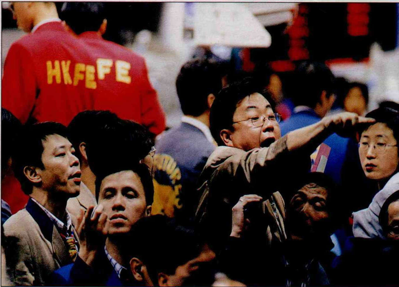 "Buy!" "Sell!" Financial markets are places where fortunes can be made and lost overnight. Their high risks and high potential profits attract people's basic gambling instincts. Pictured here is Hong Kong's futures exchange. (photo by Tsai Hsiu-ying)