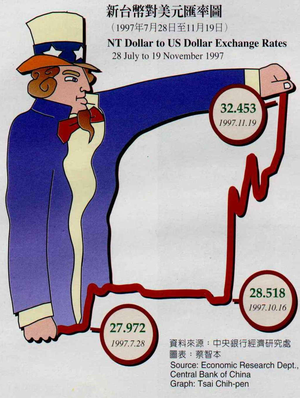 Since July, the value of the NT dollar has fallen by more than 15% against the US dollar. Particularly since mid-October, when the South Korean won became the latest target for devaluation pressure, fluctuations in the NT dollar have been unprecedentedly large, with daily swings of as much as NT$1-2. The currency trend is quite at odds with the real state of the economy, leaving many officials and academics open-mouthed.