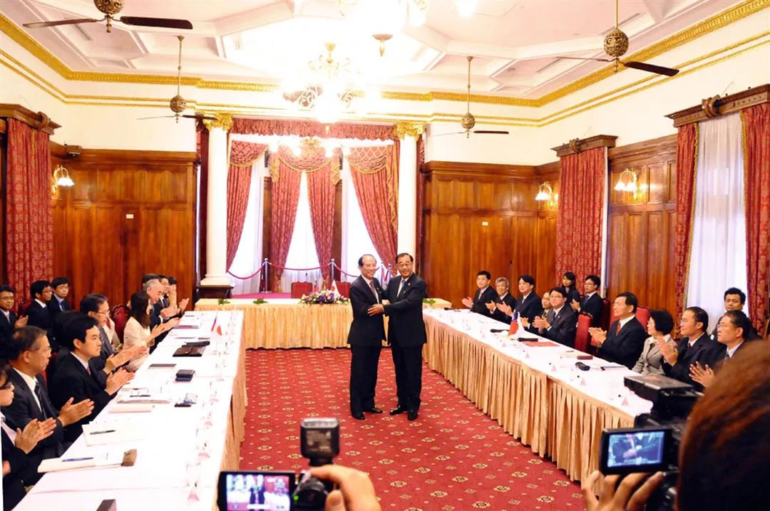 Liao Liou-yi (right), chairman of the Association of East Asian Relations, representing Taiwan, and Ohashi Mitsuo (left), chairman of the Interchange Association, representing Japan, shake hands after signing a historic fishing agreement that will protect the rights of Taiwanese fishing boats operating in the seas around the Diaoyutai Islets.