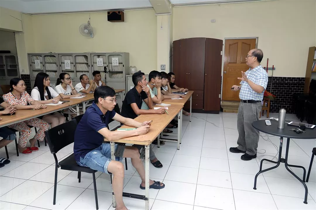 Father Hung offers lessons to migrant workers at his shelter, explaining Taiwanese legislation to them. (photo by Jimmy Lin)