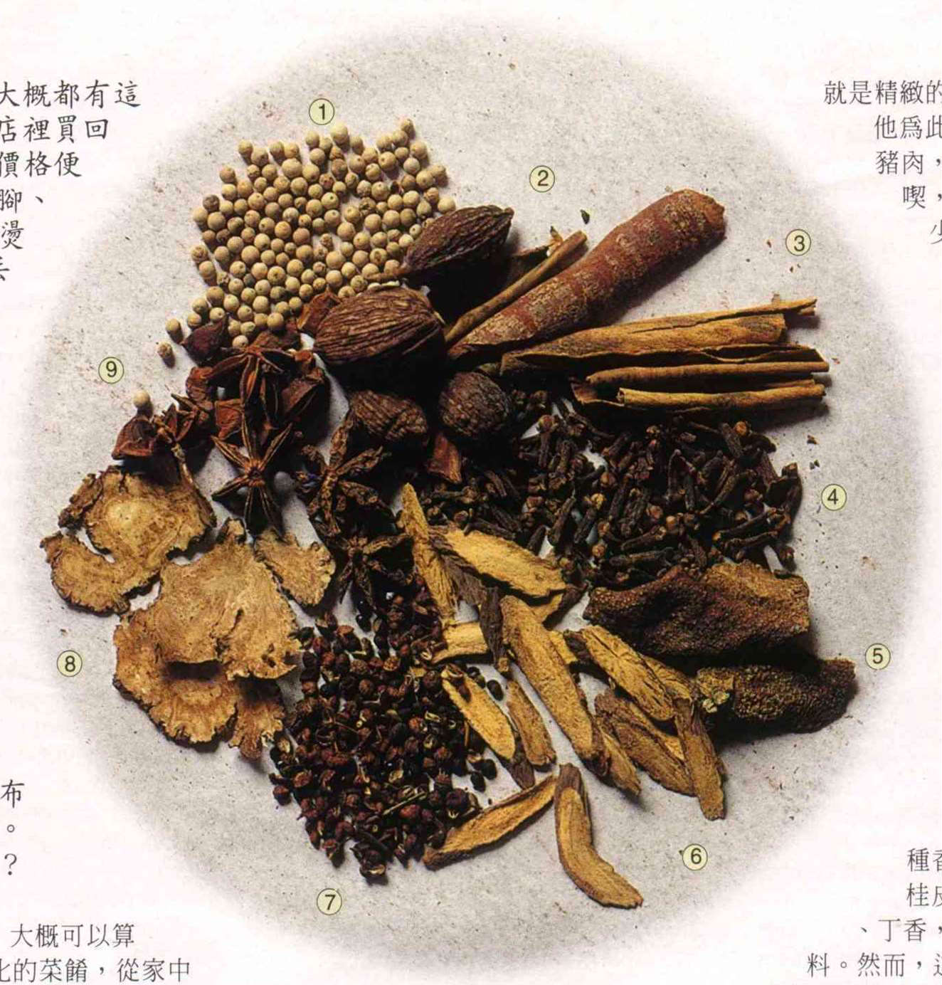 In fact, the number of ingredients in five-spice is not necessarily limited to five, but may be increased or reduced as the need arises. "Generally speaking, the ingredients used rarely depart from the ten pungent and fragrant spices of Sichuan peppercorns, star anise, cinnamon, fennel, chenpi, liquorice, cloves, cardamom, caoguo [the seed pod of tsaoko cardamom (Amomum tsaoko)] and baizhi [the root of Dahurian angelica (Angelica dahurica)]," says cooking expert Liang Chiung-pai.