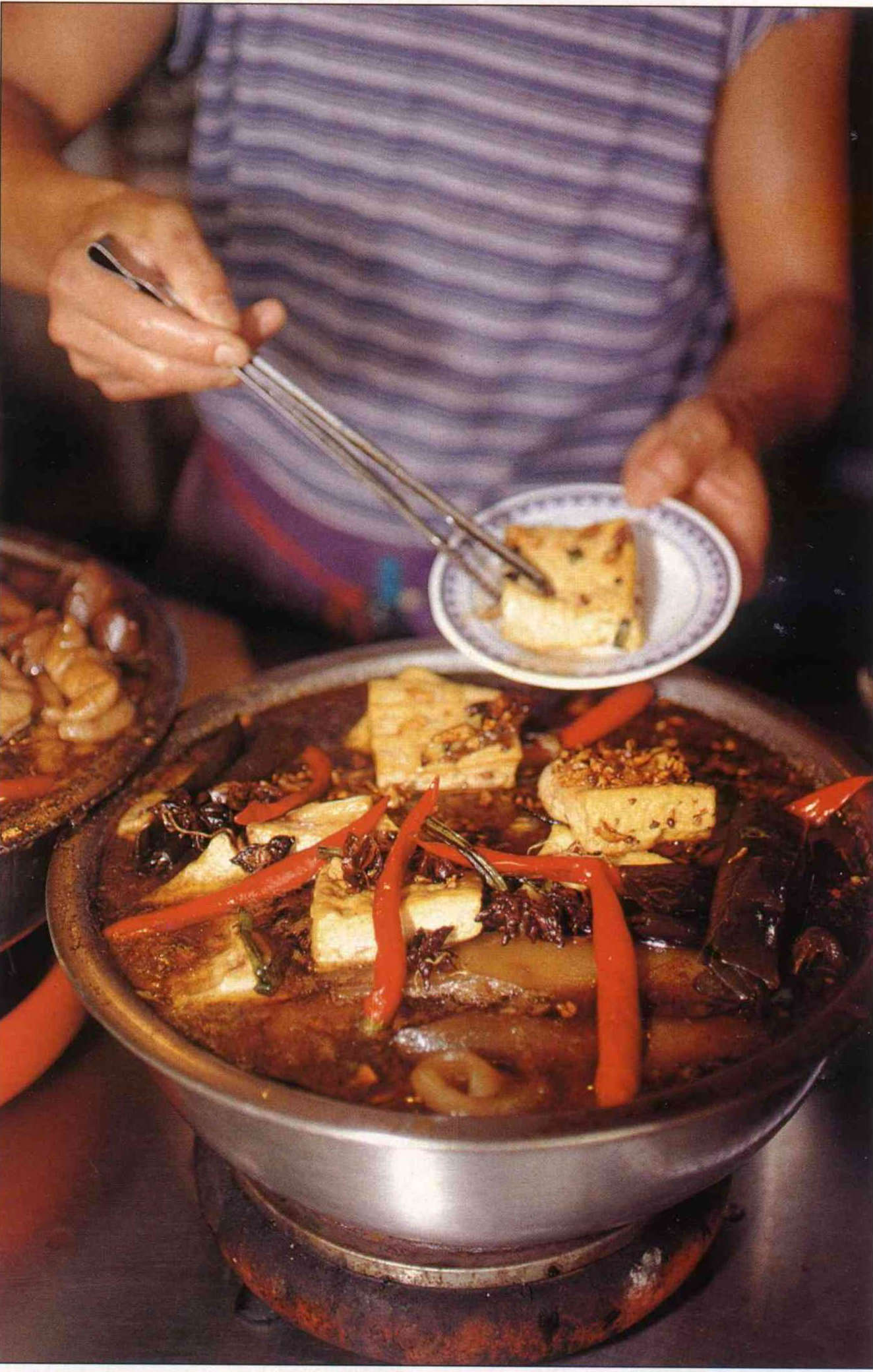 Here's something almost any Chinese who has studied abroad will have done at one time or another: you go down to the butcher's shop and come back with a bagful of feet, wings and innards-all the bits that westerners don't like-from chickens, ducks, cows and pigs. You parboil them in water, then dump the whole lot into a pan of dark, spicy stewing gravy to simmer away on a tiny flame for an hour or so, until the meaty aroma spreads far and wide, and not only Chinese are irresistibly drawn to it, but even uninitiated foreigners get the urge to cadge a morsel to taste. This is a dish which spares the pocket, pleases the palate and nourishes the body-who could ask for anything more?