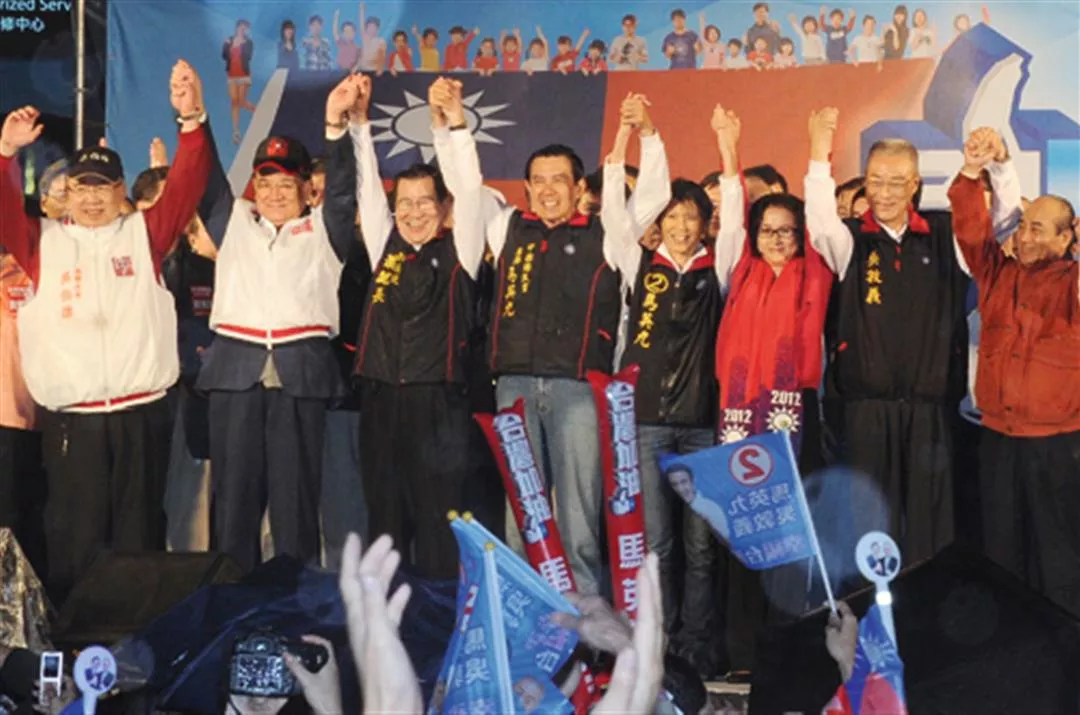 In the 2012 elections for president and Legislative Yuan members, Kuomintang candidate and incumbent president Ma Ying-jeou won re-election with over 50% of the vote. Despite the rain on election night, President Ma (fourth from left), outgoing vice-president Vincent Siew (third left), former vice-president Lien Chan (second left), and current premier and incoming vice-president Wu Den-yih (second right) all came out to thank their supporters.