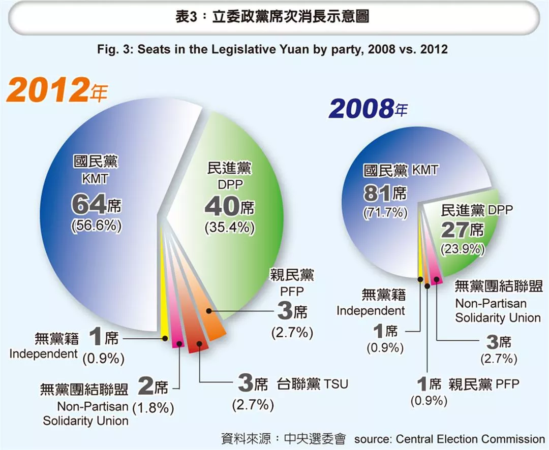 Fig. 3: Seats in the Legislative Yuan by party, 2008 vs. 2012/source: Central Election Commission