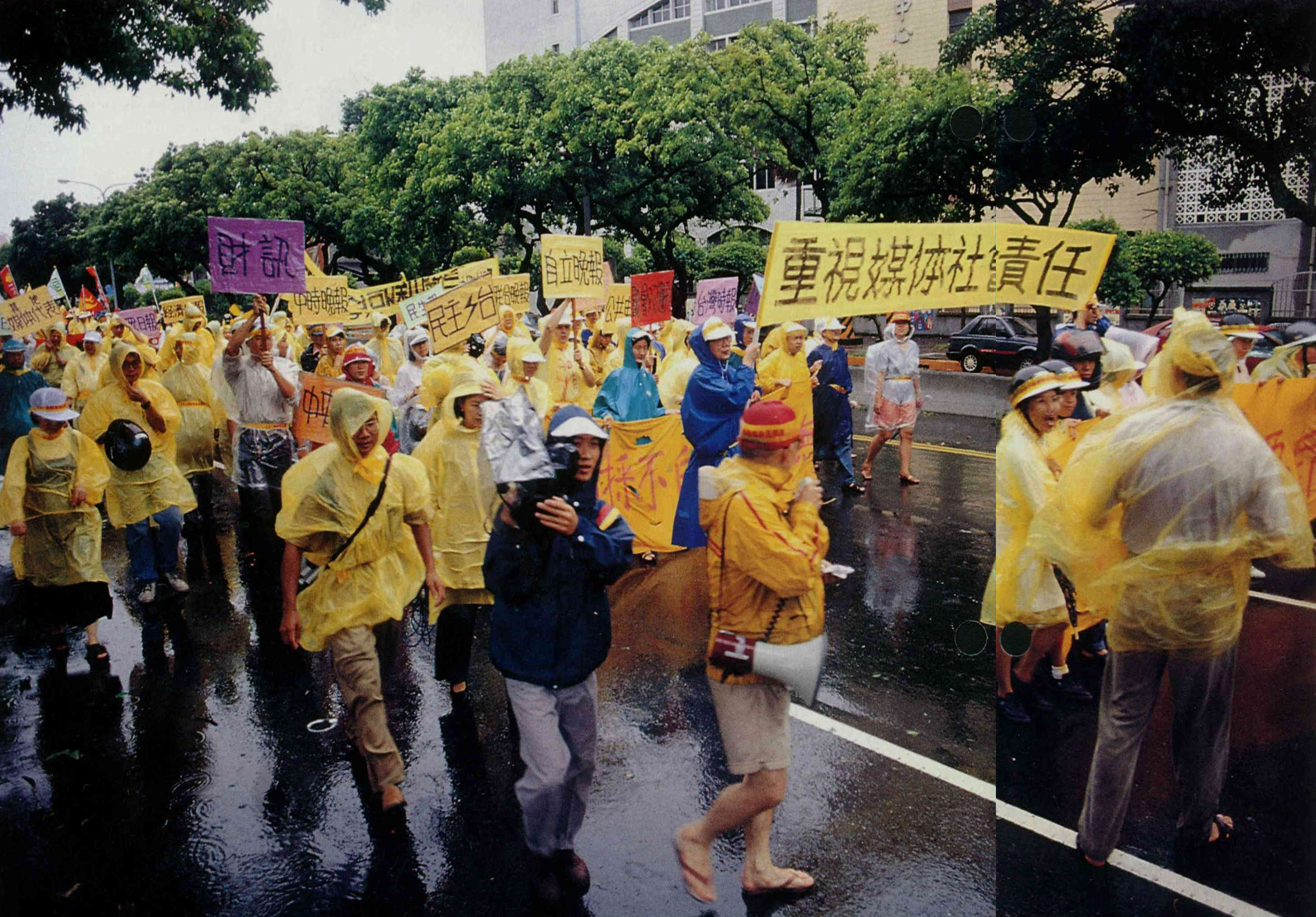 In the ten years since the ban on new newspapers was lifted, the space for free discussion has greatly widened. But media expert Hsu Chia-shih, who was originally a reporter himself, is worried about the media's tendency toward "triple flattery"-of politicians, business and the general public. The photo shows a street demonstration put on by the Association of Taiwan Journalists calling for greater social responsibility on the part of the media. (photo by Vincent Chang)