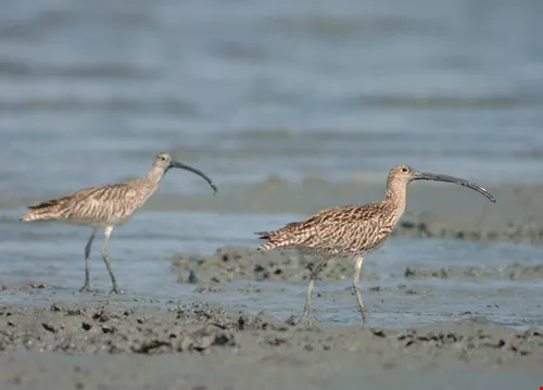 The vast mudflats of the Changhua coast are a paradise for many species of foraging water birds and benthic organisms. The photos show, from left to right, Eurasian curlews, a dunlin, a mud shrimp (Upogebia sp.), and a fiddler crab (Uca formosensis).