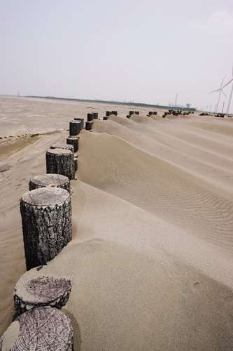 When you mention Taiwan's west coast, beautiful sand beaches, piers and lagoon sunsets come to mind. But recently it has offered another strange and impressive vista: a desert along the Changhua coast. Particularly in the fall and winter, when the northeast winds blow, the dust and sand storms here can rival Beijing's. The desert is caused by the "groyne effect," which describes how sand accumulates on the updrift side of breakwaters. Here it has created a little desert of 300 hectares, equal in area to 12 Chiang Kai-shek Memorials. It is north of the long-deserted Lunwei Industrial Zone, site of the proposed Changkung thermal power plant, which created a lot of controversy recently when it failed its environmental impact assessment.