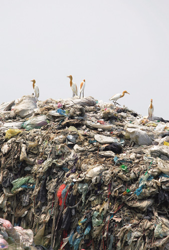 This garbage mountain juts up along the shore without anything to cover it. Beautiful cattle egrets pick at the trash and stare out to sea.