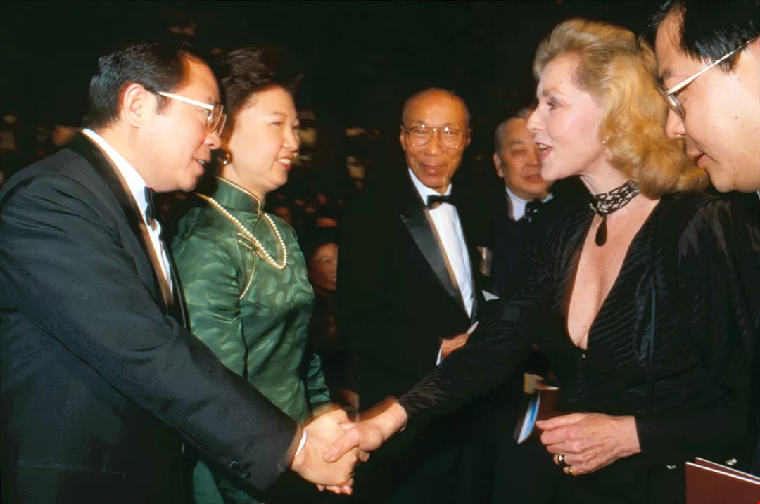Shaw Yu-ming, director general of the Government Information Office, exchanges pleasantries at a reception with Lauren Bacall, who flew to Taiwan to attend the ceremony.
