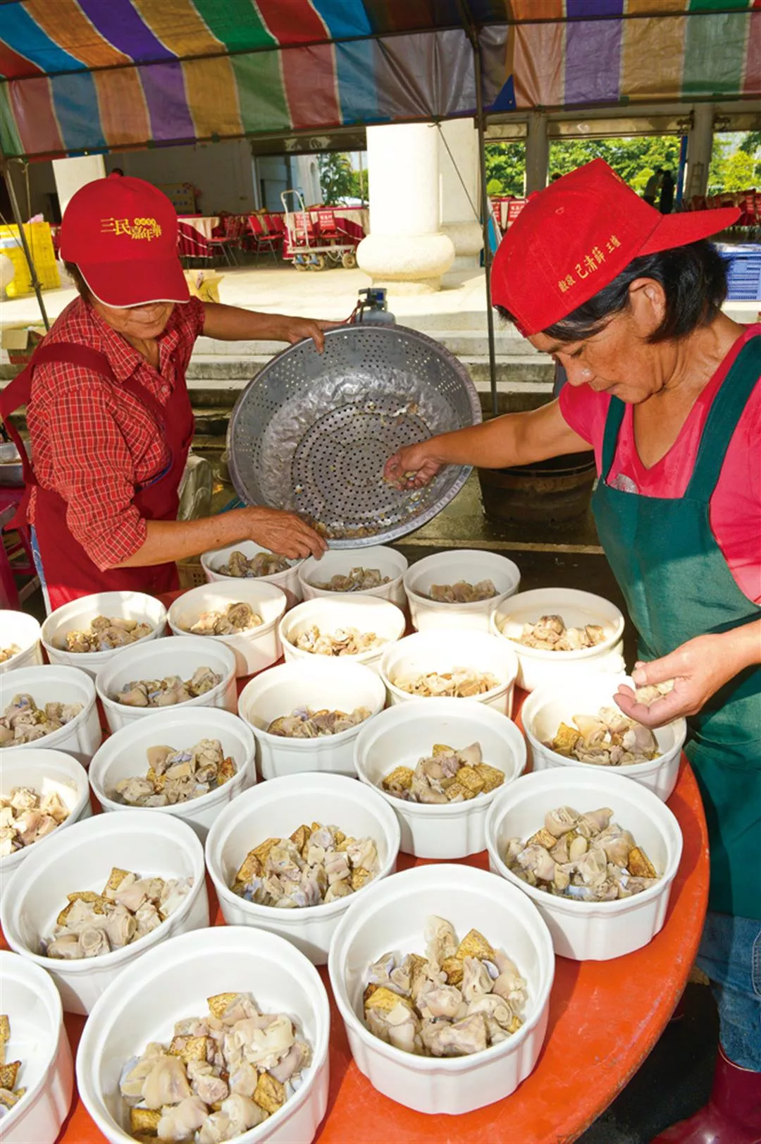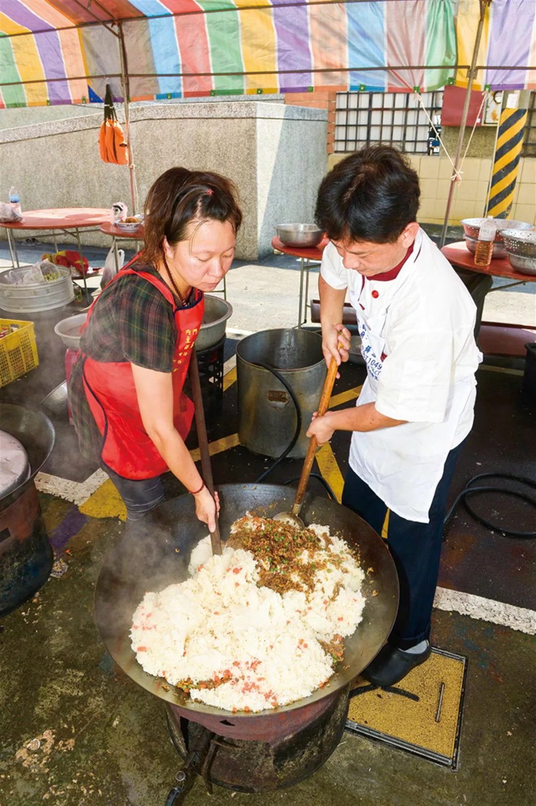 It’s six o’clock on a quiet Sunday morning. Next to the auditorium of Dongmen Elementary School in Meinong District, Kaohsiung, chef Xue Minghui and his wife Leng Dianlin with four or five assistants are hurriedly chopping vegetables and meat in preparation for a banquet. As the midday deadline approaches, stove fires burn intensely as workers’ voices are raised in urgency.