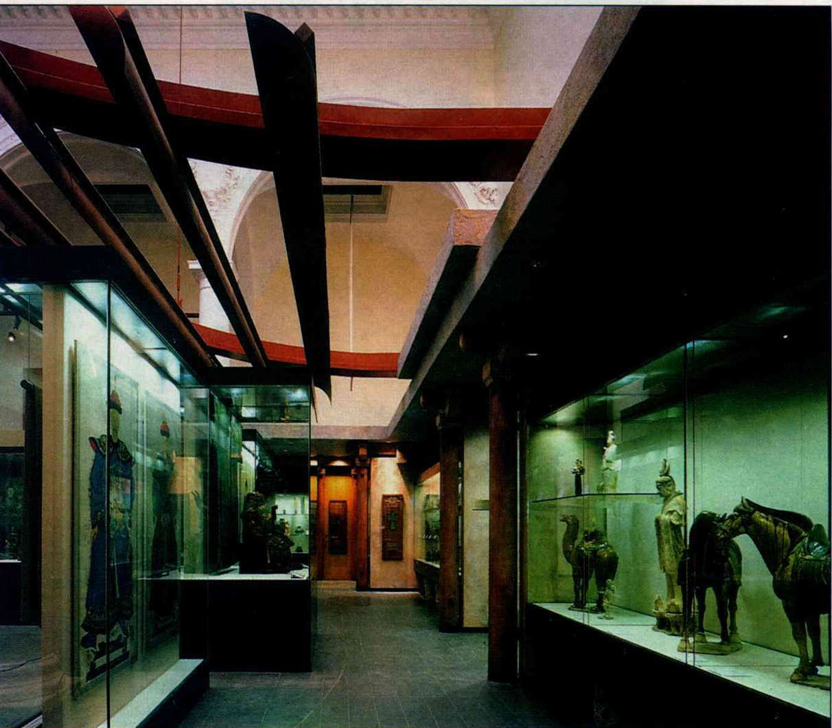 To help achieve this Chinese atmosphere, a huge steel-framed canopy, "like the spine of a dragon," was hung from the ceiling from where it sweeps down over the whole gallery. An ancient tomb was also reconstructed using real clay bricks from the Han dynasty taken from the museum collection. The company had thus "created an intelligent display that adds meaning to the collection," in accordance with their desire to make the display even more "stimulating, informative and even theatrical."
