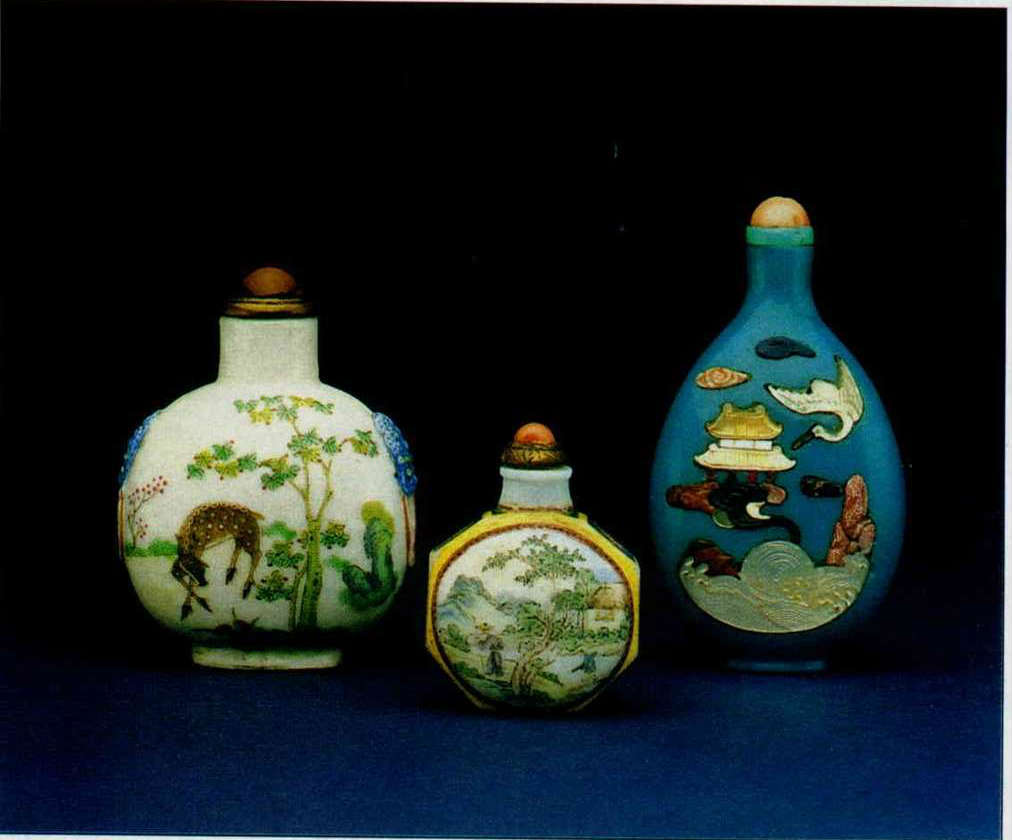 Snuff bottles. At far right is one made of exquisite inlaid glass from the Ching dynasty.