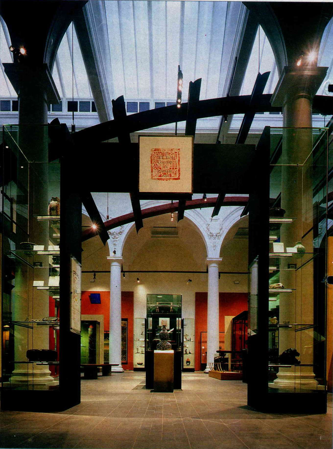 Seeing the vermilion pillars and large signs that are hung around the gallery announcing the six categories of Eating and Drinking, Living, Burial, Temple and Worship, Ruling, and Collecting, it is unlikely that people will pass it by. A huge T'ang dynasty bronze Buddha sits atop four pillars in the centre of the gallery and overhead the "dragon spine" soars aloft, so as to filter the light and hide the neo-classical architecture above.