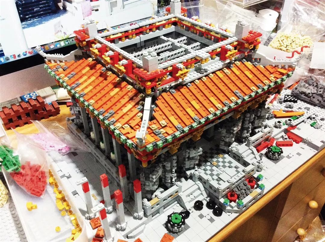 Great B.W. had to overcome all sorts of technical challenges to construct Longshan Temple, his first large-scale work of Lego art, shown here partly built. He had to devise creative ways to represent ornate columns and beams, as well as the corbel brackets that support the eaves in traditional temples throughout the Far East. (courtesy of Chen Guan-zhou)