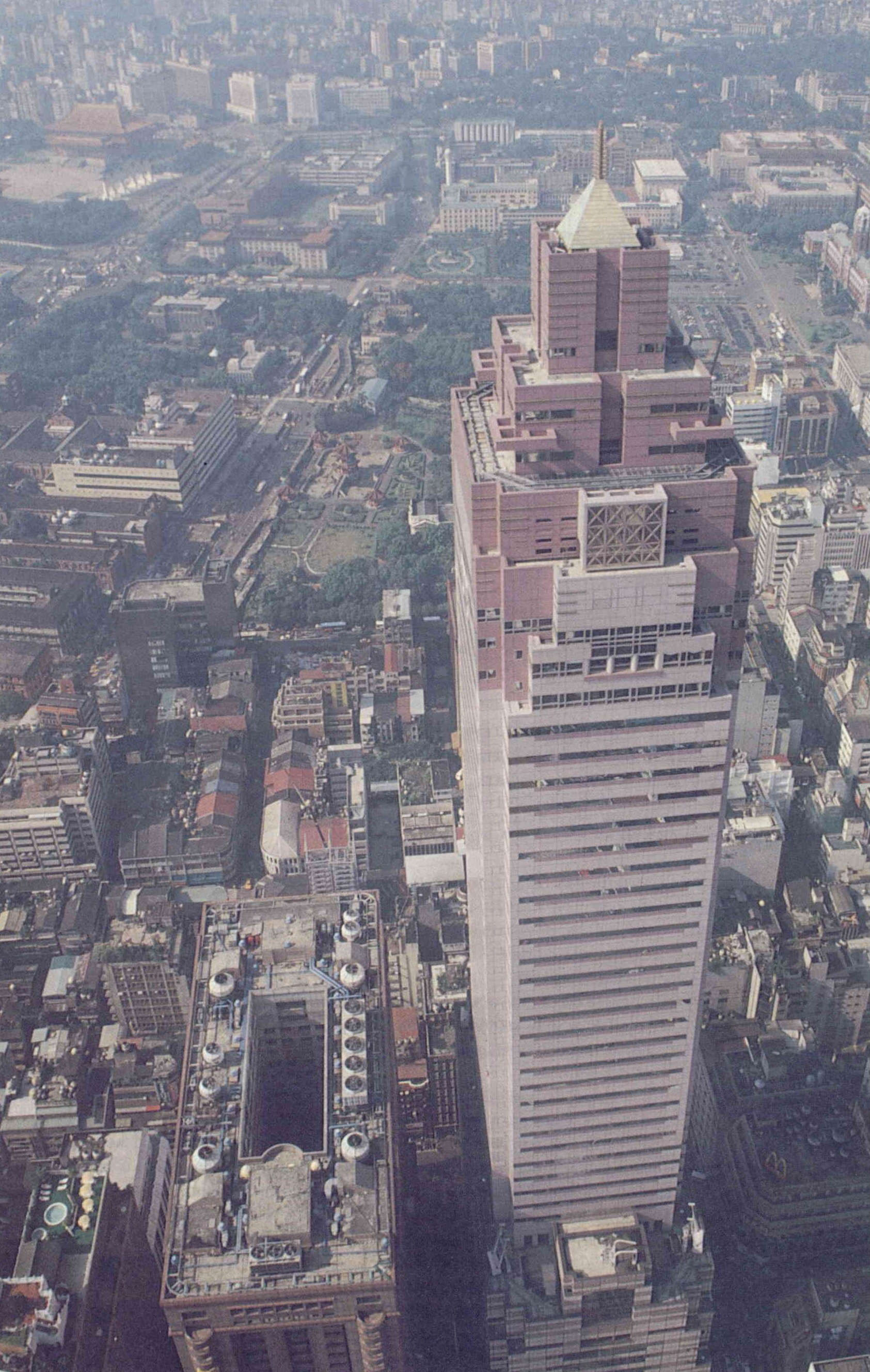 The 51-story Shin-Kong Mitsukoshi Building is a Taipei landmark, and the Po-ai District behind it is the center of ROC government power. The Presidential Palace is visible in the upper right corner of the photograph.