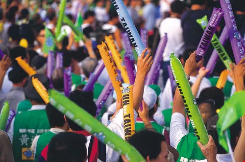 Due to special political and historical circumstances, many Taiwanese citizens passionately participate in politics and are acutely sensitive to political issues, and "talking head" programs also flourish. The photo shows a scene from the "UN for Taiwan"demonstration staged in 2007 by the DPP to rally public support.