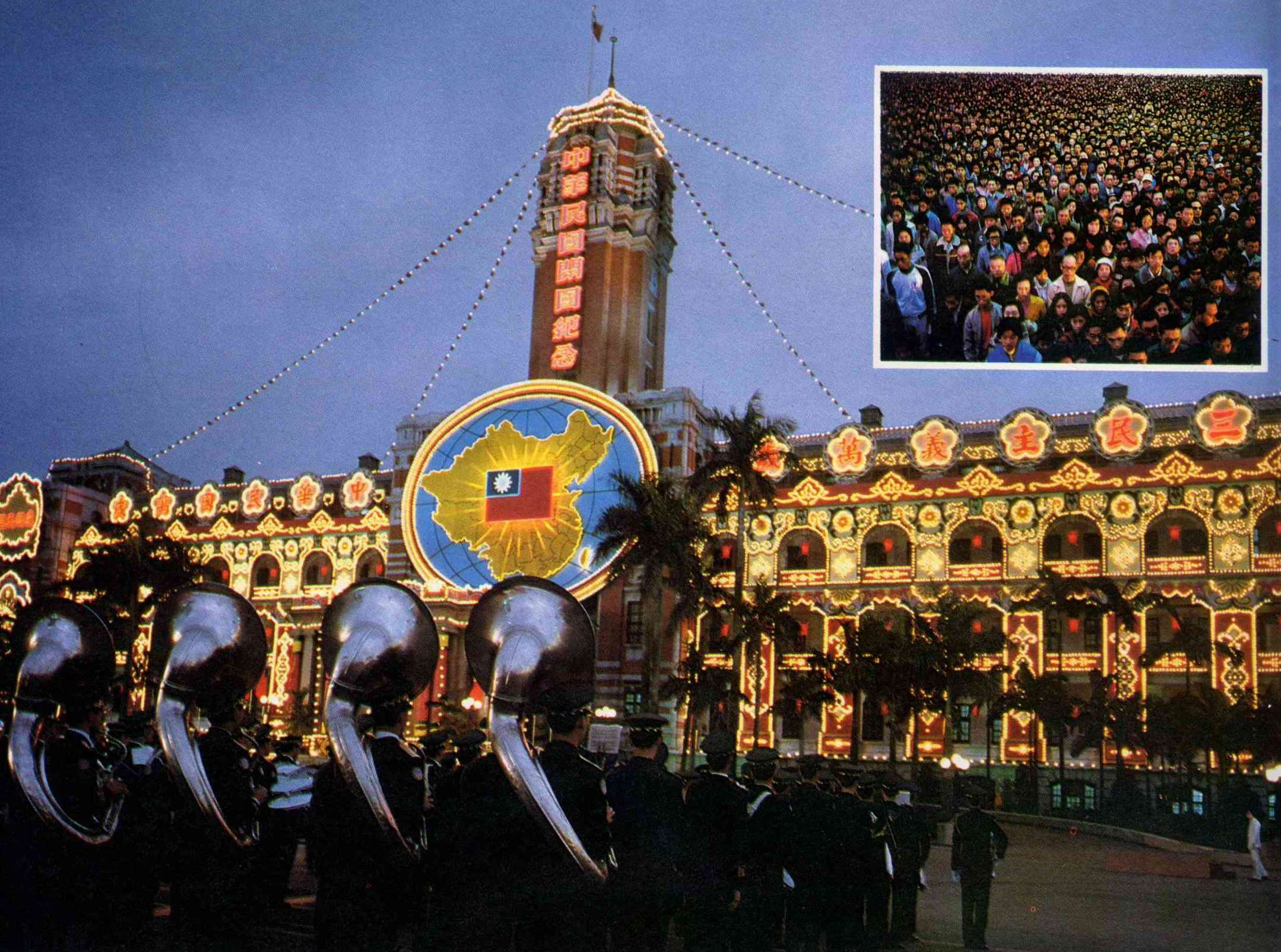 From afar, the people could see the Presidential Building outlined in colorful lights. Chinese characters meaning "70th founding year of the Republic of China," and "in commemoration of the founding of the Republic of China" shimmered in the cold air.