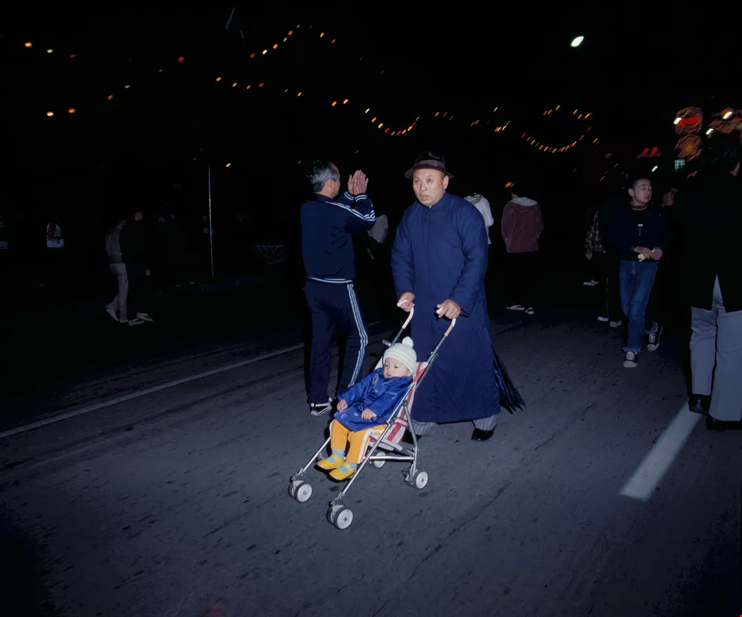 This old man and child brave the cold morning air to participate in this New Year's celebration.