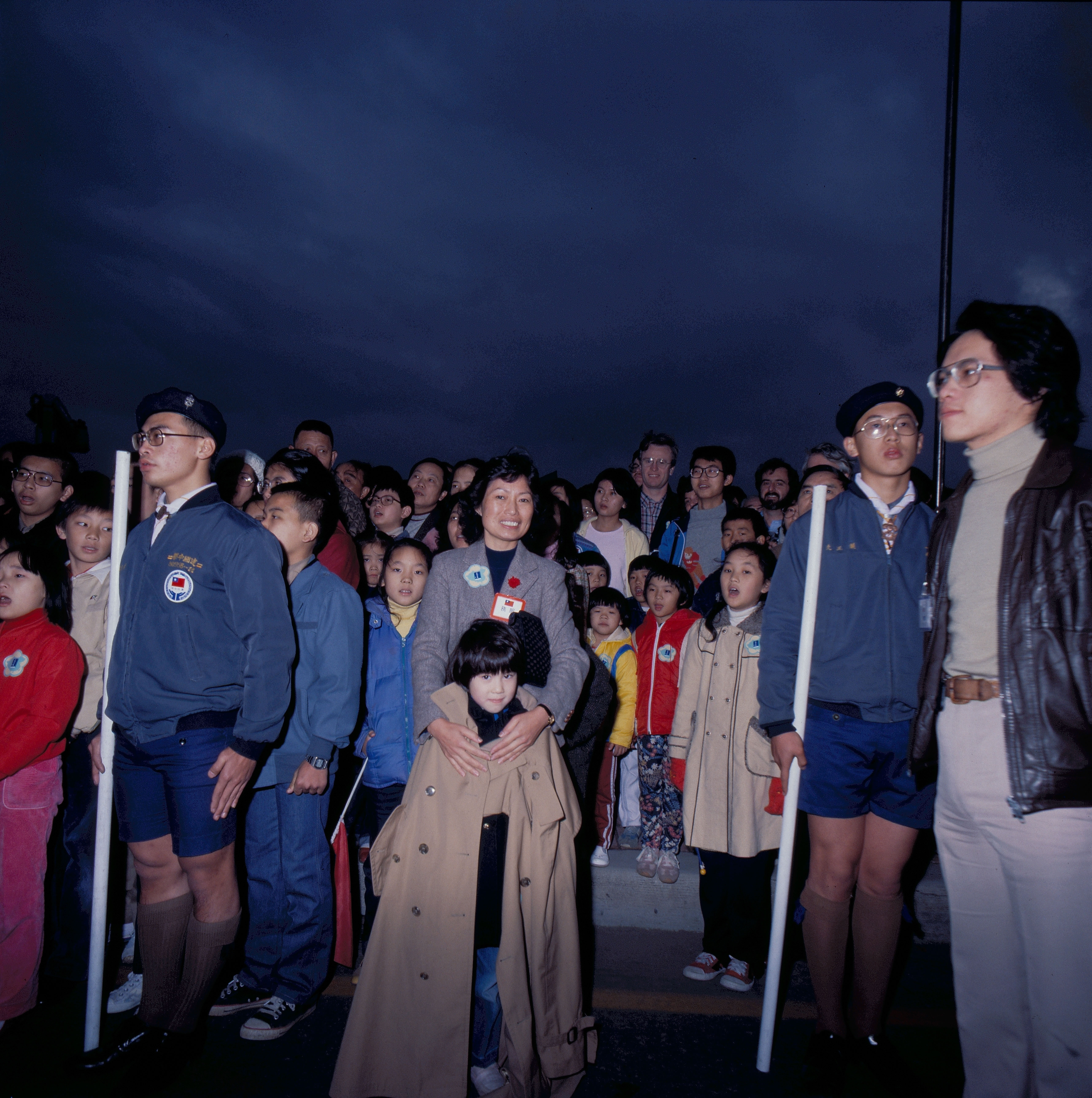 Tens of thousands of people converged at the Presidential square for the dawn flag-hoisting ceremony to mark the 70th year of the founding of the Republic of China. Students, a handicapped old lady in a wheel chair, and Yang Ssu-yung, a mainland student who has settled in Taiwan, and members of his family all arrived at the square early in the morning, to marvel at the significant pageant.