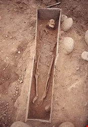 Groups of stone sarcophagi lie one level further down. Over 2,000 have been uncovered. The sarcophagi appear to be individually constructed and are all oriented northeast-southwest and facing Mt. Tulan. Most of the sarcophagi contain one body laid out straight and facing upwards. A few of the sarcophagi hold the remains of several people, up to fifteen, who are possibly the members of a clan buried together over time. The biggest difference among the sarcophagi is the number of fine funerary items found, which indicate differences in social status.