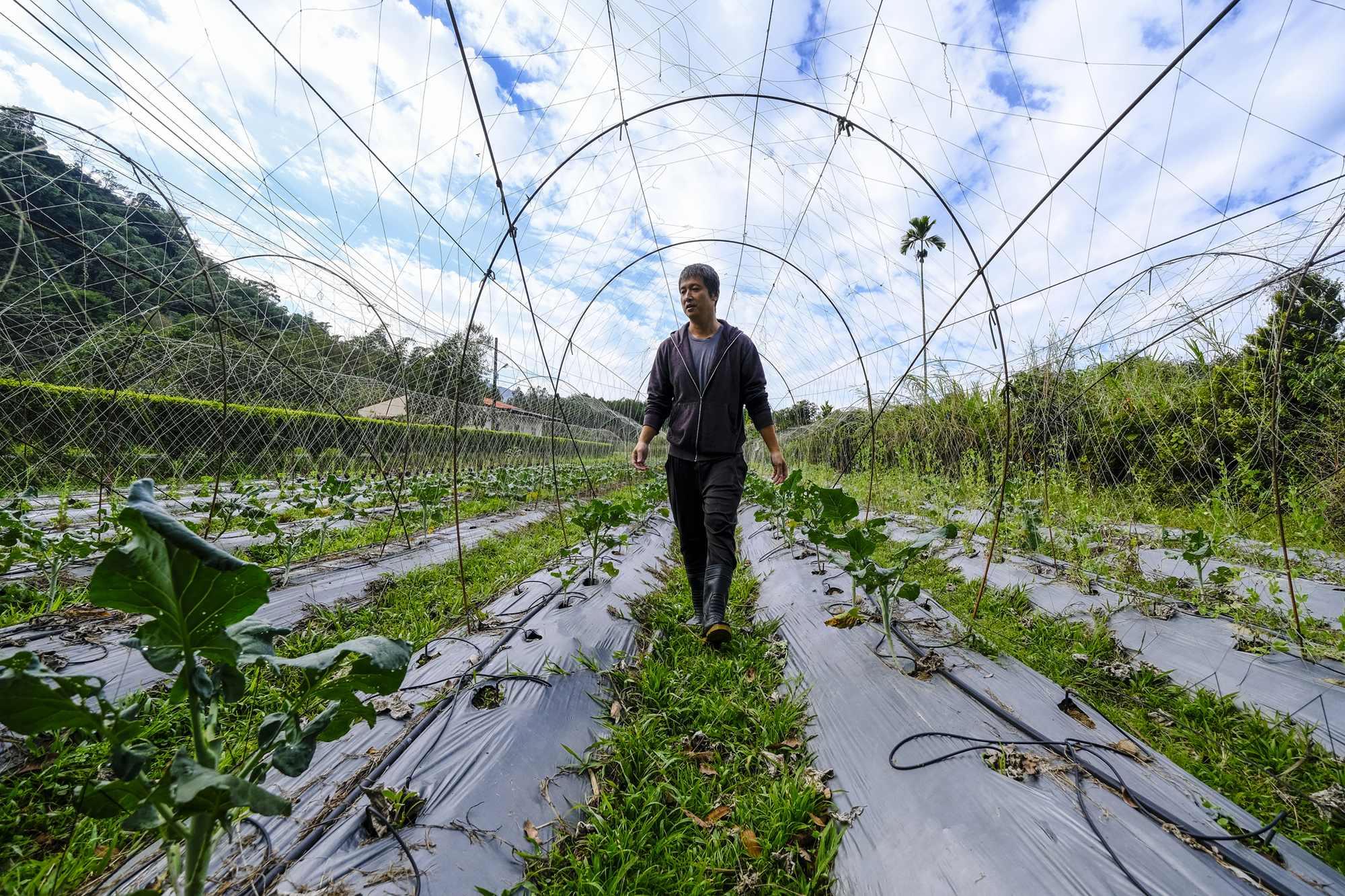 Stepping on wild vegetation, Liao Yousheng of Jun Yuan Farm checks on how well his crops are growing.