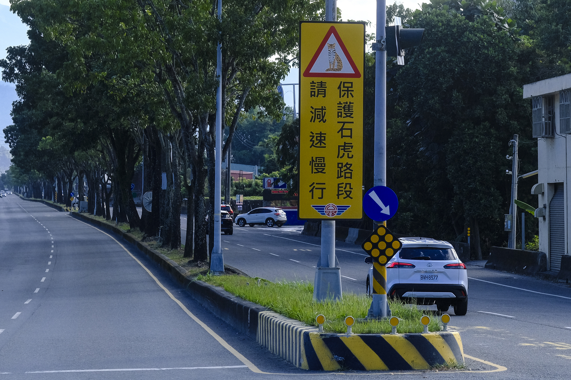 Warning signs placed near leopard-cat roadkill hotspots remind drivers to slow down and proceed with care.