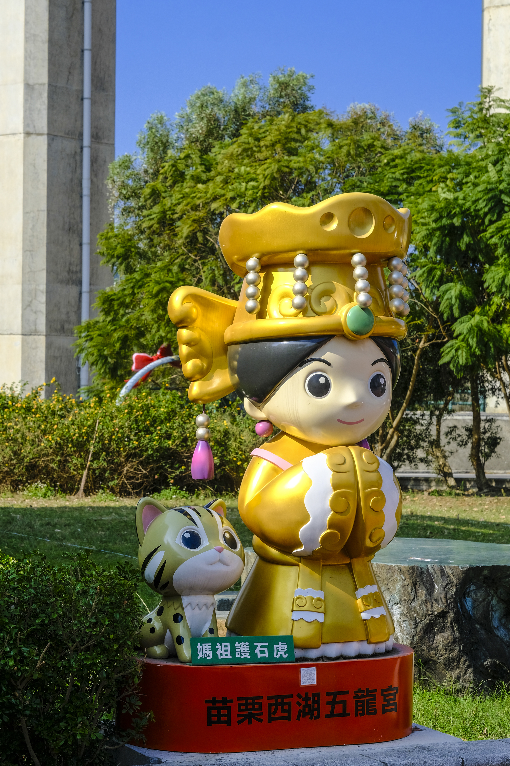 This statue of “Mazu protecting leopard cats” in the courtyard of Wulong Temple in Xihu, Miaoli County, reminds people that leopard cats live all around us.
