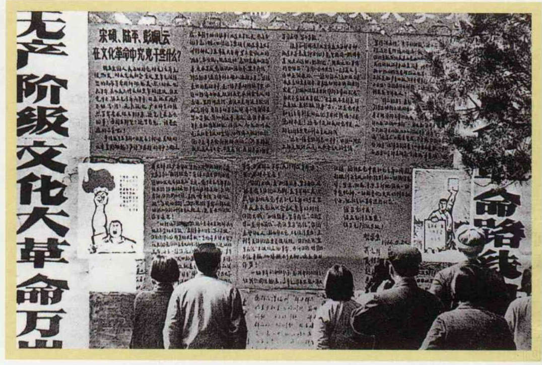 The first big-character poster, personally approved by Mao Zedong, was pasted up at Beijing University. It was covered in lists of the "Counter revolutionary" crimes of people criticized at "struggle meetings."(courtesy of Chinese Refugees Relief Association)