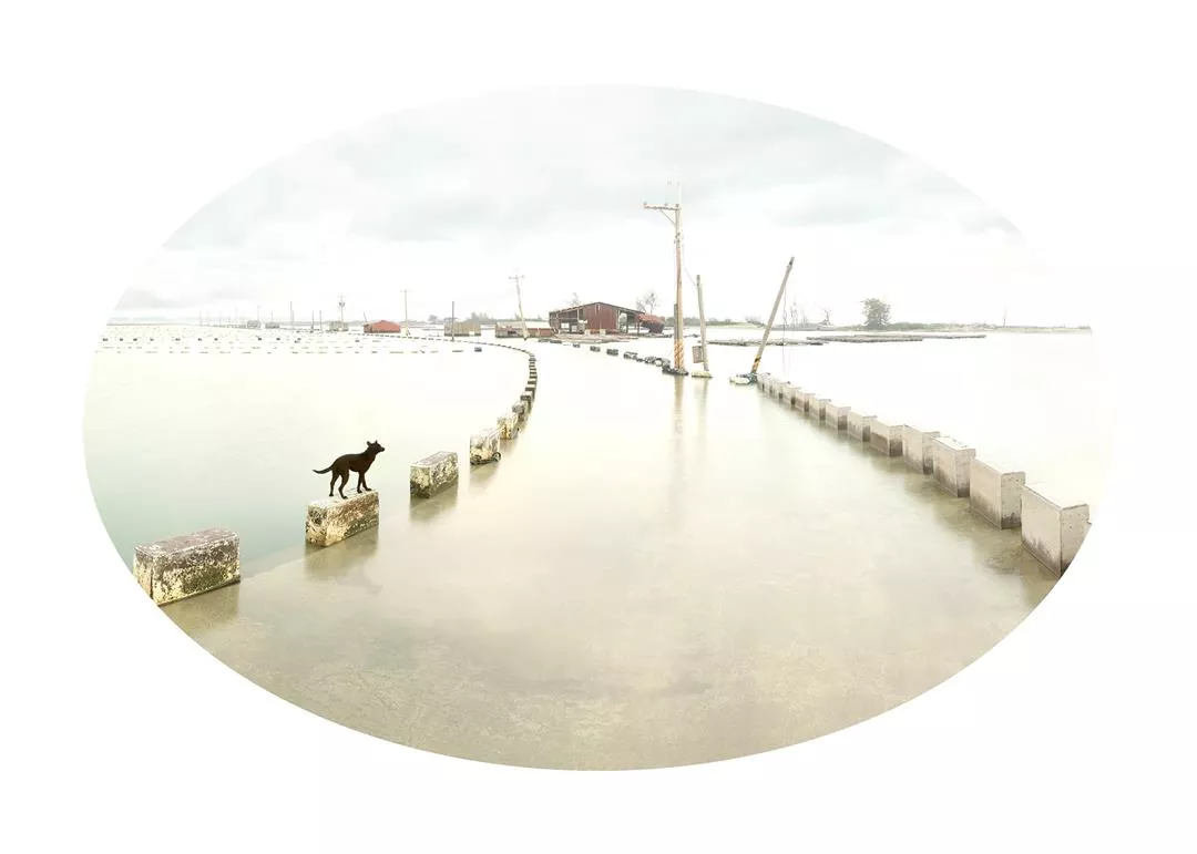 Returning to the “down to water” motif, all of Yang Shun-fa’s images contain boundless expanses of water in their backgrounds, and his photographic subjects, which are often besieged by the water, convey a sense of isolation. The buildings in The Submerged Beauty of Formosa remind us of the limitations of human civilization, while the dogs in Taiwan To Go express more optimistically the persevering spirit of the island’s people in the face of future uncertainties. These are allegorical images that whisper admonishments in an elegant manner. Threatened with impending environmental disasters, we are invited to reconsider our relationship with nature from a more respectful and sustainable (as opposed to exploitative) point of view.