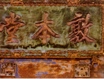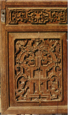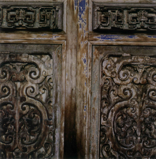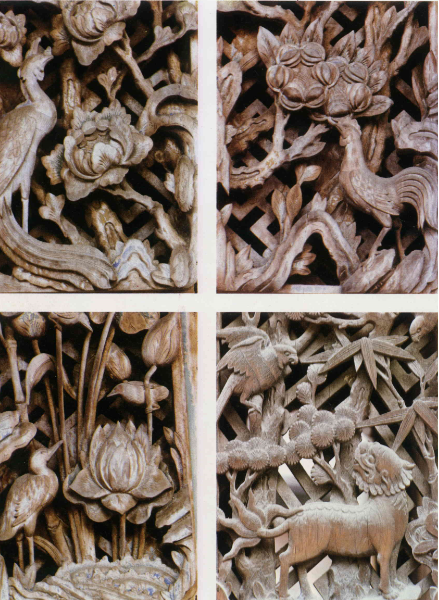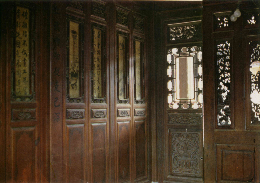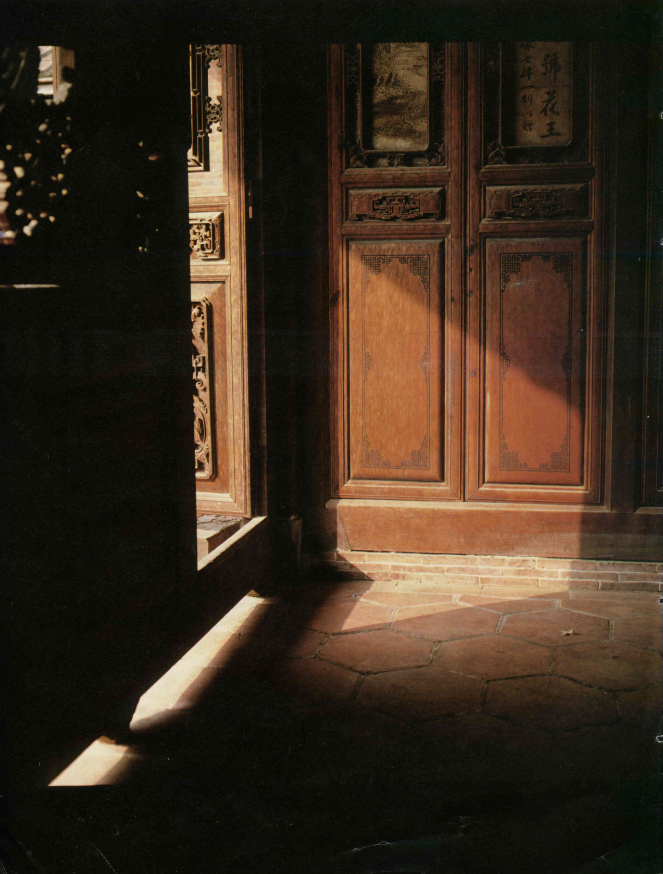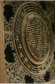 Wooden carvings are a special feature of Tunbentang, found on windows, doors and ceilings. While the Chinese characters inscribed on doors have become illegible with the passage of time, clearly visible are the diagrams of the Book of Changes inlaid around the brass door knockers (center).