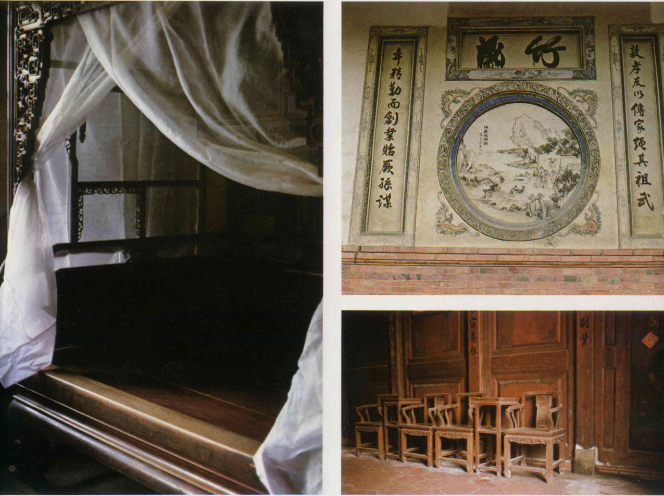 While the paintwork has faded, the beauty of the carvings remains (picture left). Pictures right show a wooden bed, a wall painting with Chinese characters, and Chinese chairs in the hall next to the ancestral tablet surrounded by fruit, cakes and incense.