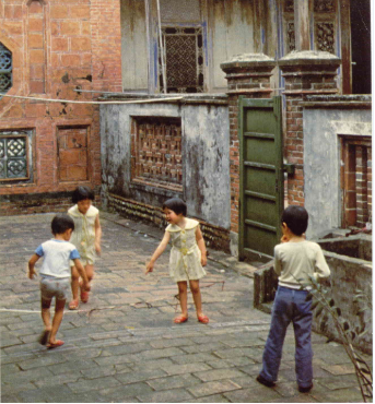 Pictures left and above right show the wooden paneling in the house and children playing in the courtyard. Below right is the Lin family graveyard with tables and chairs in place. The sumptuous quarters for the family ancestors are an indication of the traditional belief that honoring the dead will benefit the living.