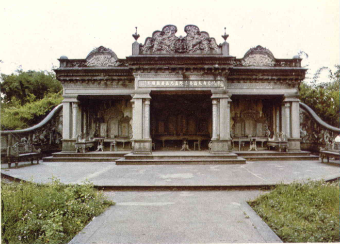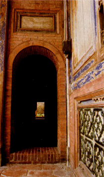 The front door or Tunbentang leads to the hall (pictures left) inside which there is a wooden screen carved with pine trees, deer and bats, which has fascinated many visitors. Another feature is the broad, unpainted beams. Outside, a large tree (center) provides shade for passers-by, while the courtyard inside is paved with stones and lined with plots of flowers.