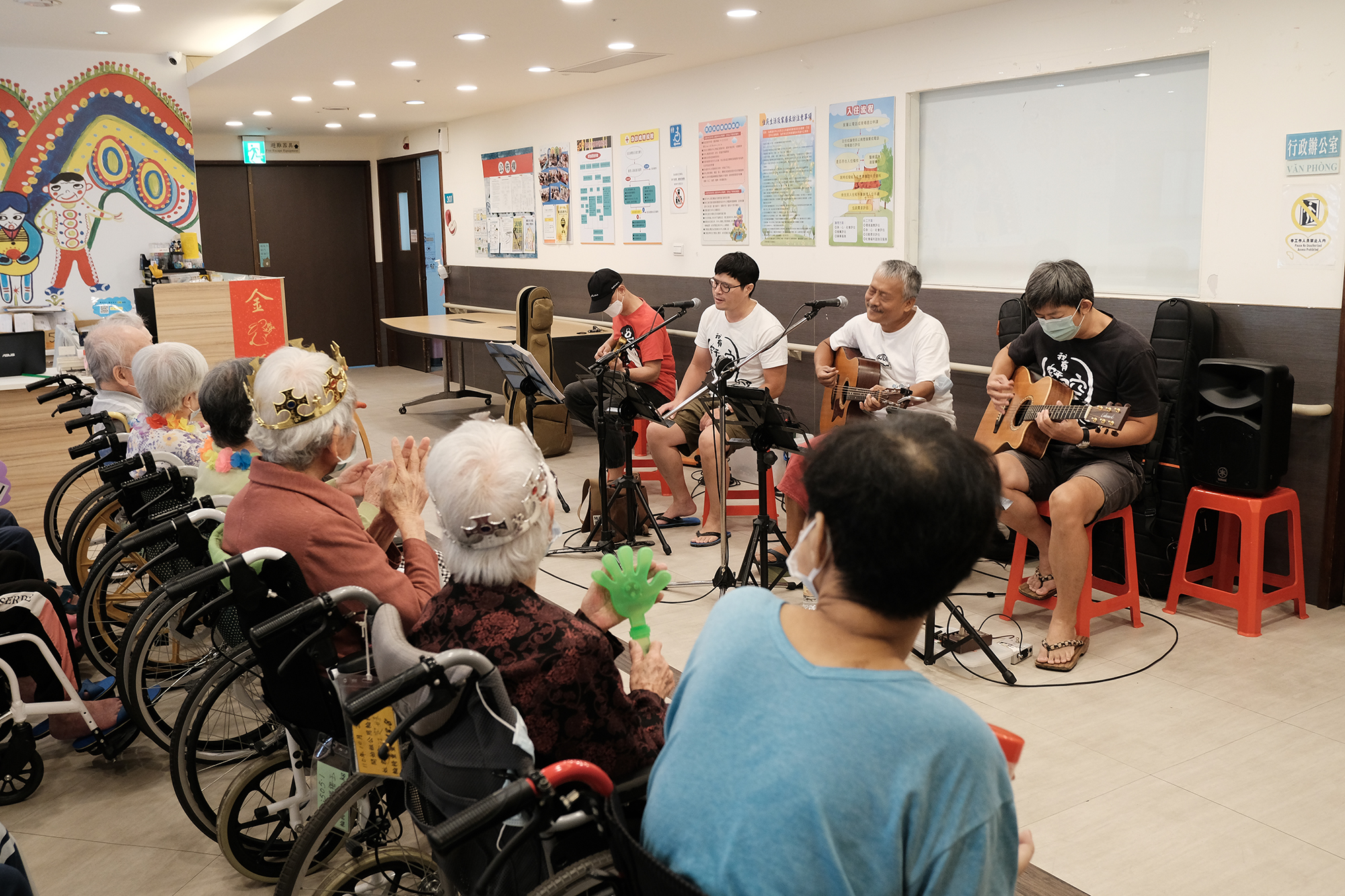 The band PunCar tours medical institutions and nursing homes around Taiwan to perform for elderly people and help them recall the days of their youth. (courtesy of Liann Long-Term Care Center)