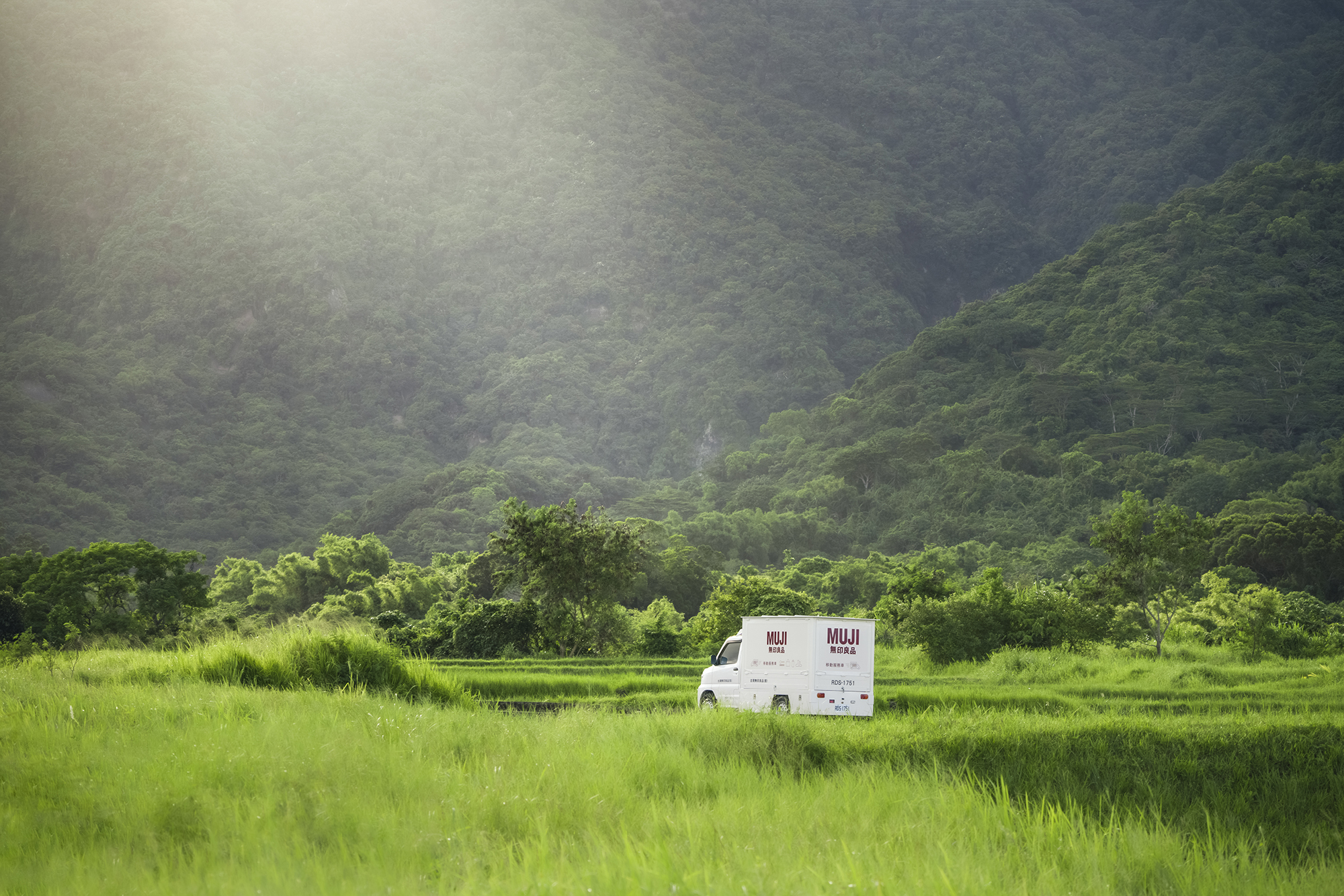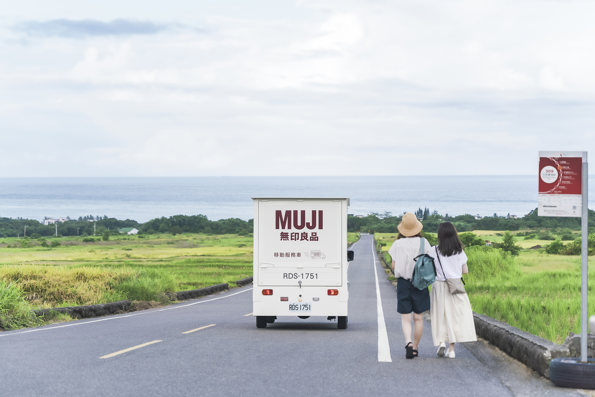 Muji’s mobile services vehicle visits townships throughout Taitung. The photo shows the scenic “King Kong Avenue” in Changbin Township. (courtesy of Muji Taiwan)
