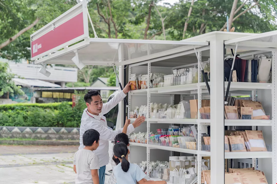 Gary Huang, who drives Muji’s mobile service vehicle, usually works alone, driving to remote places and handling inventory, inquiries, and sales. After noticing that many elderly residents have their grandchildren living with them, he thoughtfully brings along illustrated storybooks to entertain the children while their grandparents shop, transforming into a storyteller.