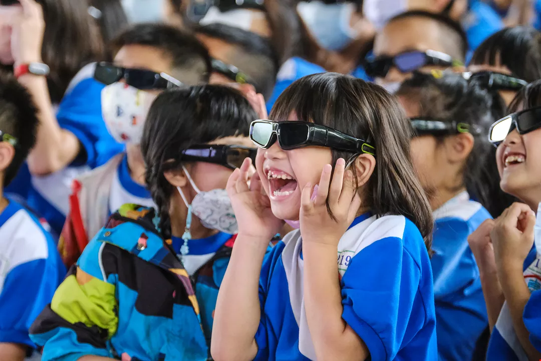 Children wear 3D glasses to watch a movie about Taiwan’s beautiful scenery, which seems close enough to reach out and touch. Their smiles provide the motivation for the Formosa 3D team to continue touring.