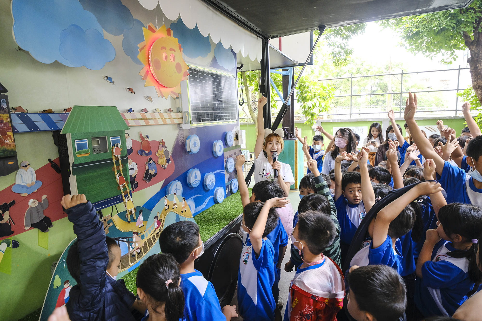 Besides showing films, the Formosa 3D movie truck serves as a green energy classroom. Here the host explains vividly how solar power works.