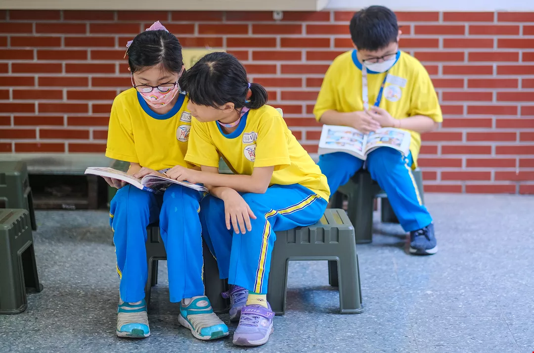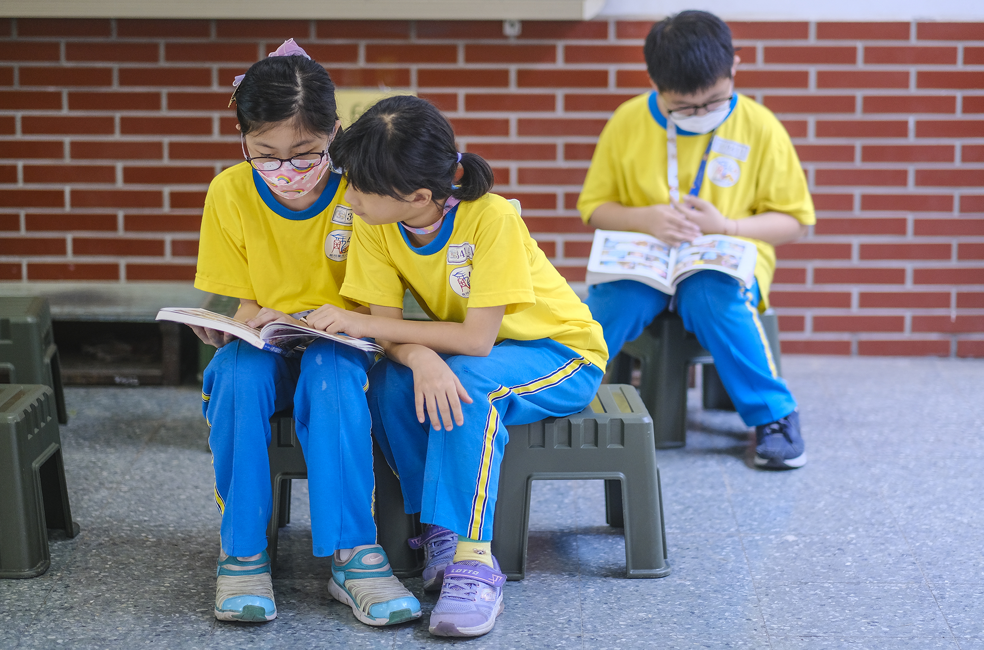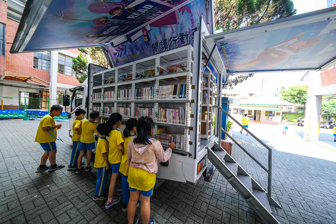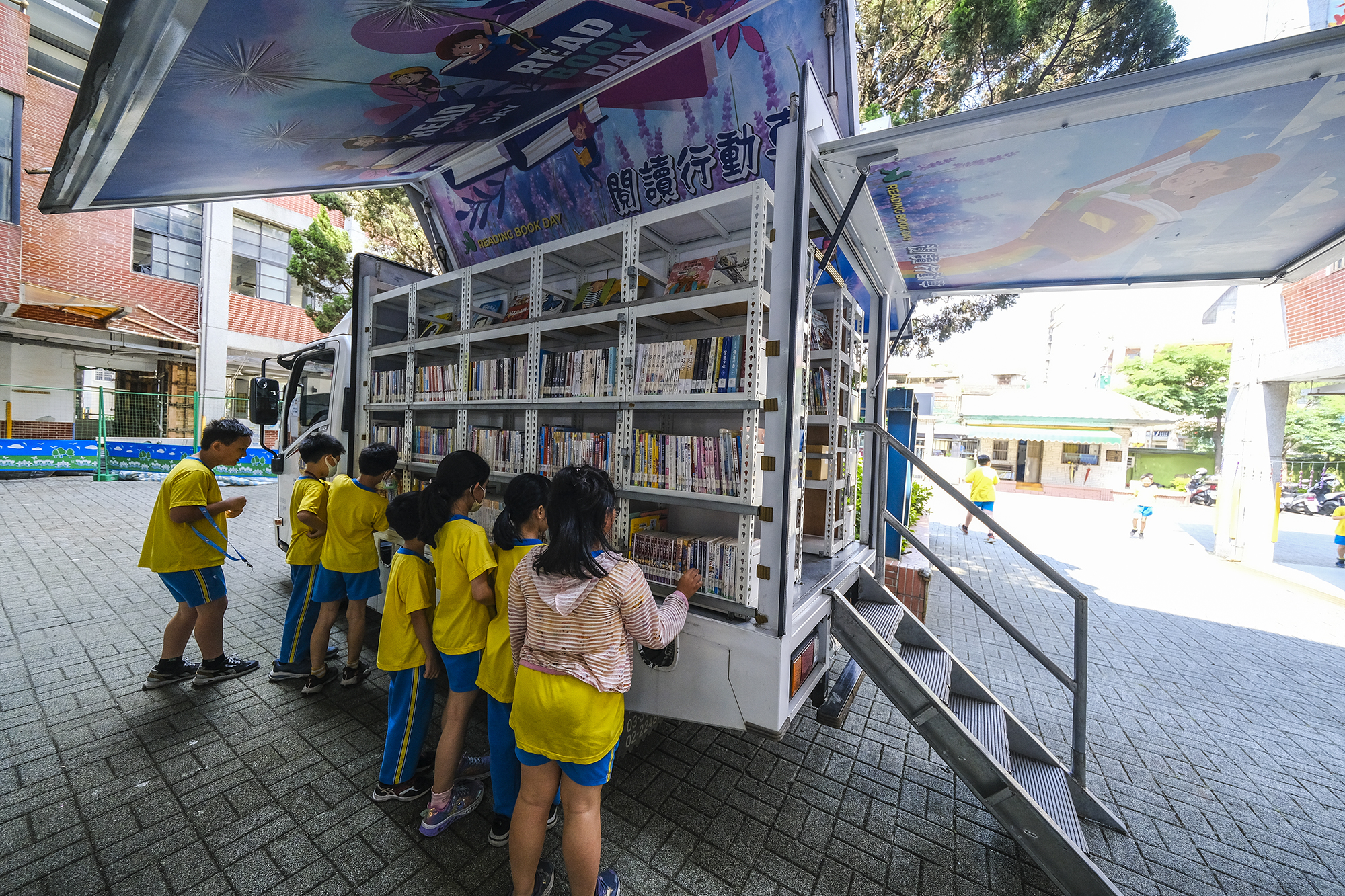 We follow one of the bookmobiles of the Taoyuan Public Library (TPL) as it visits Longgang Elementary School in Taoyuan’s Zhongli District. After the vehicle stops, the TPL staff open the gull-wing doors on both sides and neatly set up tables and chairs in the school’s entrance hall. Thus the truck is quickly transformed into a library ready to welcome young readers.